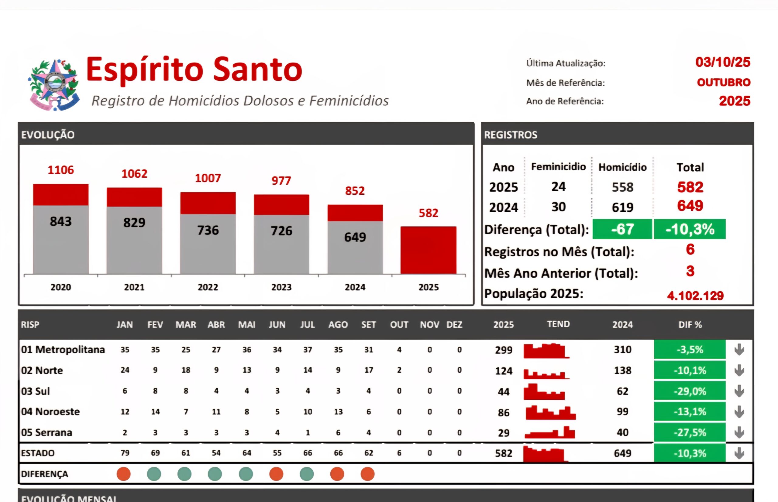 Apenas 3,5% (ou 11 ocorrências) separam a Região Metropolitana da Grande Vitória da zona vermelha de homicídios em 2025. A faixa vermelha é atingida quando a Região Integrada de Segurança Pública (RISP) supera o número de homicídios do mesmo período no ano anterior.